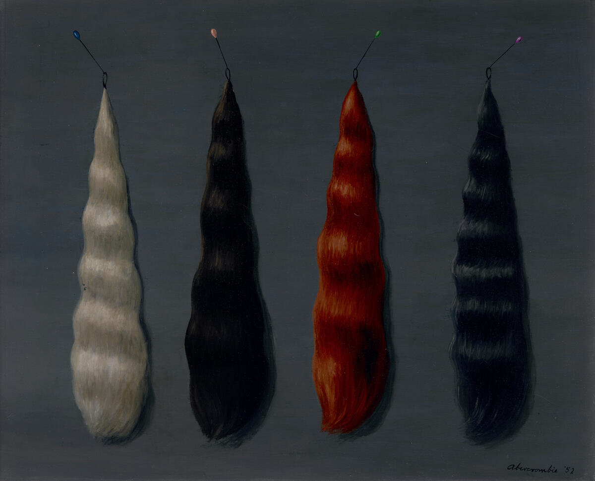 Black cats, broomsticks, and other stereotypical attributes of sorcery often feature in Gertrude Abercrombie’s many self-portraits. The four extensions of differently colored hair in Witches’ Switches continue this theme, while also relating to the theatrical way the artist presented herself. In fact, Abercrombie’s self-presentation earned her the unofficial title of Chicago’s “queen of the bohemian artists.” She once said of her paintings: “I am not interested in complicated things nor in the commonplace. I like and like to paint simple things that are a little strange. My work comes directly from my inner consciousness and it must come easily.” This emphasis on the unusual and unexpected links Abercrombie’s paintings to the surrealist works by John Wilde and Kay Sage.